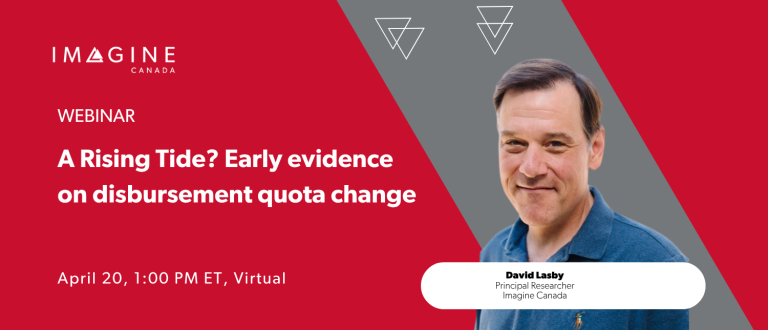 Webinar - A Rising Tide? Early evidence on disbursement quota change. Join us on April 20 at 1 p.m. ET as David Lasby, Principal Researcher at Imagine Canada, walks through our preliminary analysis of the new DQ rules and what the early data tells us.